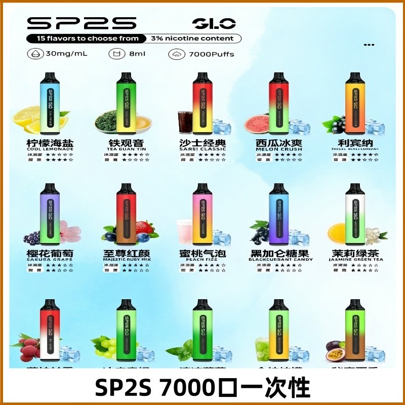 SP2S GLO 7000口一次性電子煙,配備8mL大容量煙油與600mAh電池,提供15種精緻口味,涵蓋水果、清涼、茶飲等,滿足多元需求。採用雙芯霧化技術,煙霧細膩,擊喉感純正,支援Type-C快充。
